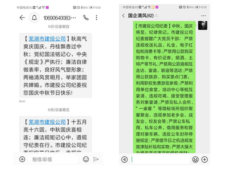 發(fā)送廉政短信。中秋國慶前期和期間,公司紀(jì)委向全體干部員工及控股企業(yè)領(lǐng)導(dǎo)班子成員累計發(fā)送廉政短信348條次,通過企業(yè)微信群累計發(fā)送廉政提醒14次,在表達(dá)節(jié)日祝福的同時,提醒廣大領(lǐng)導(dǎo)干部嚴(yán)格遵守廉潔自律各項(xiàng)規(guī)定,繃緊廉潔自律這根弦,筑牢拒腐防變這道防線。